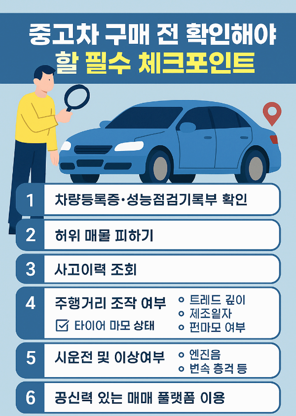 중고차를 처음 구매하거나 차량 교체를 고려하는 분들에게 가장 중요한 건 안전성과 신뢰입니다. 하지만 중고차 시장에는 허위 매물, 주행거리 조작, 사고 이력 은폐 등 다양한 함정이 도사리고 있습니다. 중고차를 구매할 때 반드시 확인해야 할 핵심 체크포인트 7가지를 정리해드리며, 안전하고 합리적인 구매를 위한 정보를 제공합니다.